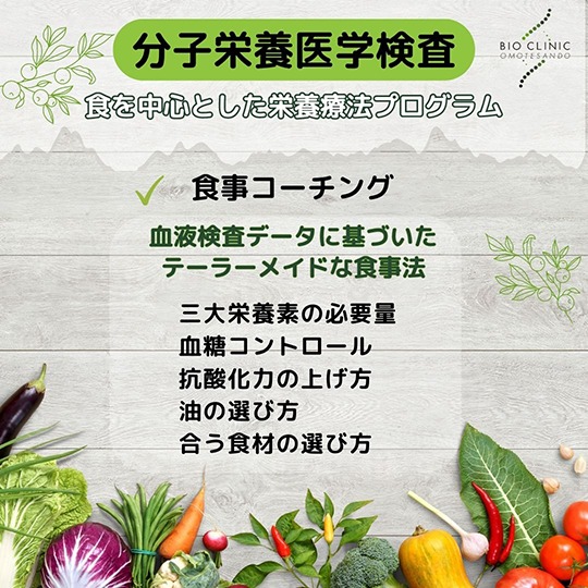 コーチングでは具体的に〔三大栄養素の必要量や血糖コントロール〕〔抗酸化力のあげ方や油の選び方〕〔合う食材の選び方〕などについて、幅広く知識を身につけていただきます。